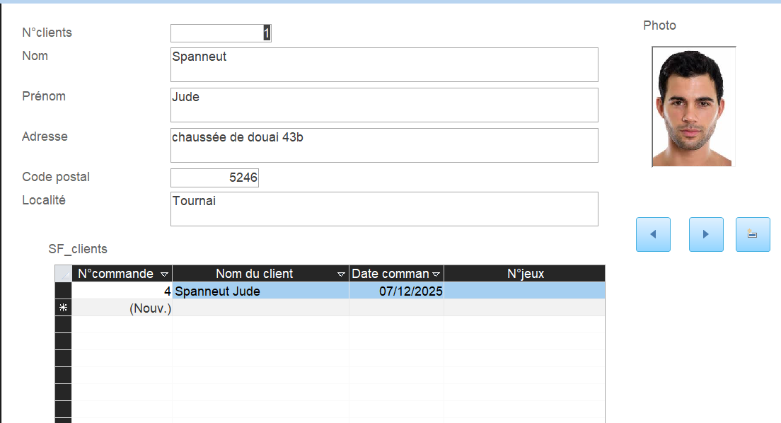 La base de données contient trois formulaires distincts, conçus pour faciliter et accélérer l’encodage des données. Le premier permet d’ajouter de nouveaux clients ou de modifier leurs informations personnelles. Le deuxième sert à enregistrer les jeux et leur quantité en stock, avec une option de modification ultérieure. Enfin, le dernier formulaire est dédié à l’enregistrement des commandes ; il inclut un bouton permettant de générer une facture à partir d'un état, prête à être envoyée. Un état supplémentaire permet également de dresser l'inventaire complet du stock.