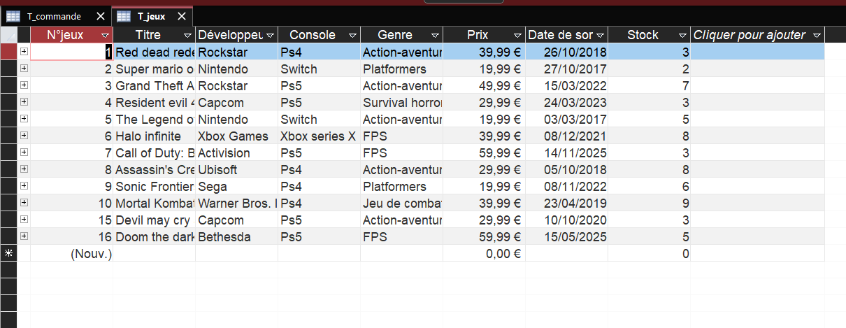 La base de données contient trois formulaires distincts, conçus pour faciliter et accélérer l’encodage des données. Le premier permet d’ajouter de nouveaux clients ou de modifier leurs informations personnelles. Le deuxième sert à enregistrer les jeux et leur quantité en stock, avec une option de modification ultérieure. Enfin, le dernier formulaire est dédié à l’enregistrement des commandes ; il inclut un bouton permettant de générer une facture à partir d'un état, prête à être envoyée. Un état supplémentaire permet également de dresser l'inventaire complet du stock.